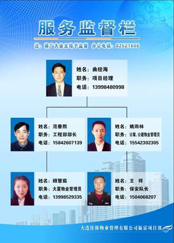 為了更好地聆聽業(yè)主的心聲,不斷地提升自身的服務品質,大連佳保物業(yè)公司于2017年4月25日在振富大廈會議室召開懇談會,共計10位業(yè)主代表參與其中,并在大廈大堂設置服務監(jiān)督欄,請廣大業(yè)主給予監(jiān)督。